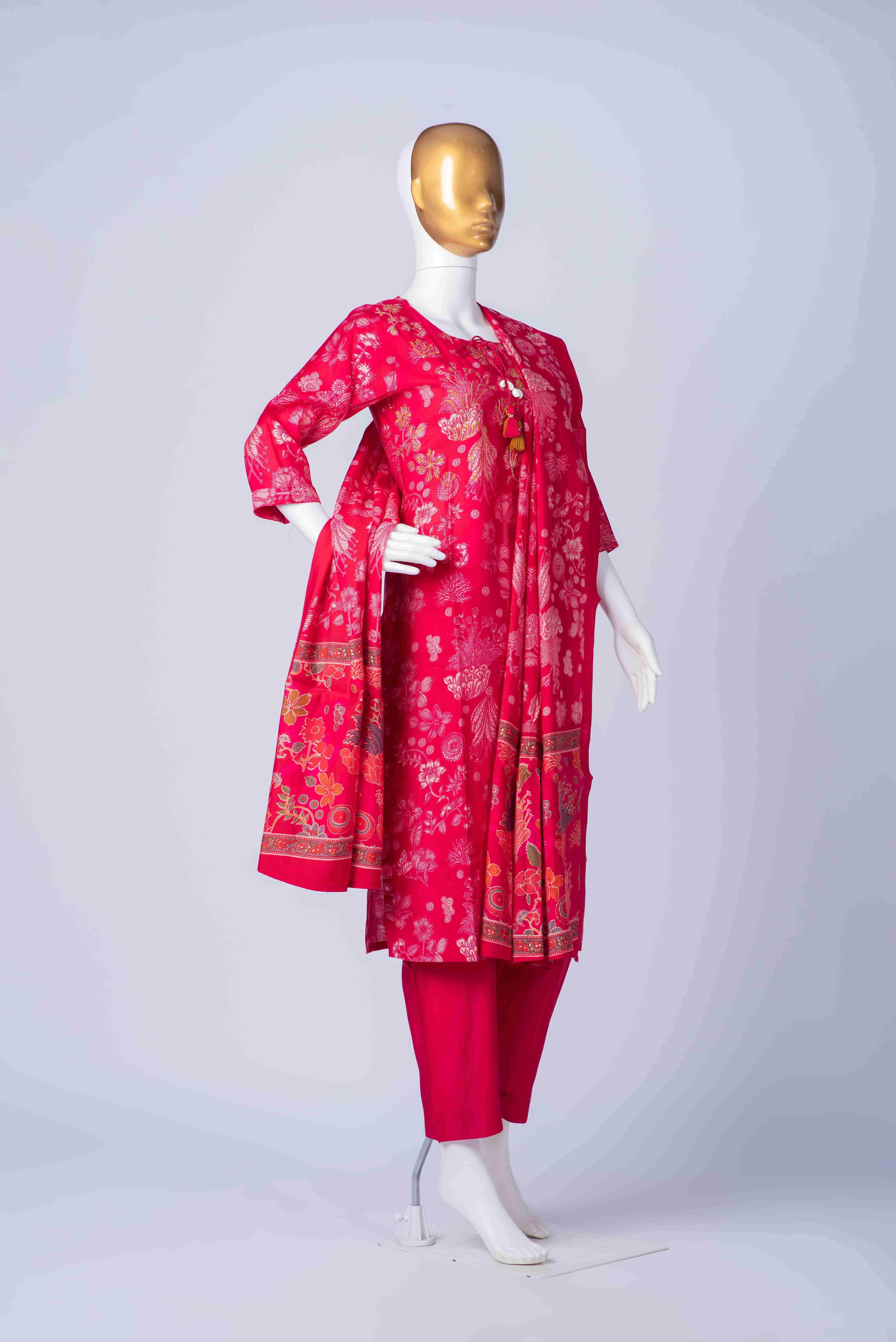 A digitally printed pure muslin heavy silk kurti which is highlighted with embroidery work in the yoke. The silk dupatta is beautifully printed with the pants crafted from silk fabric.