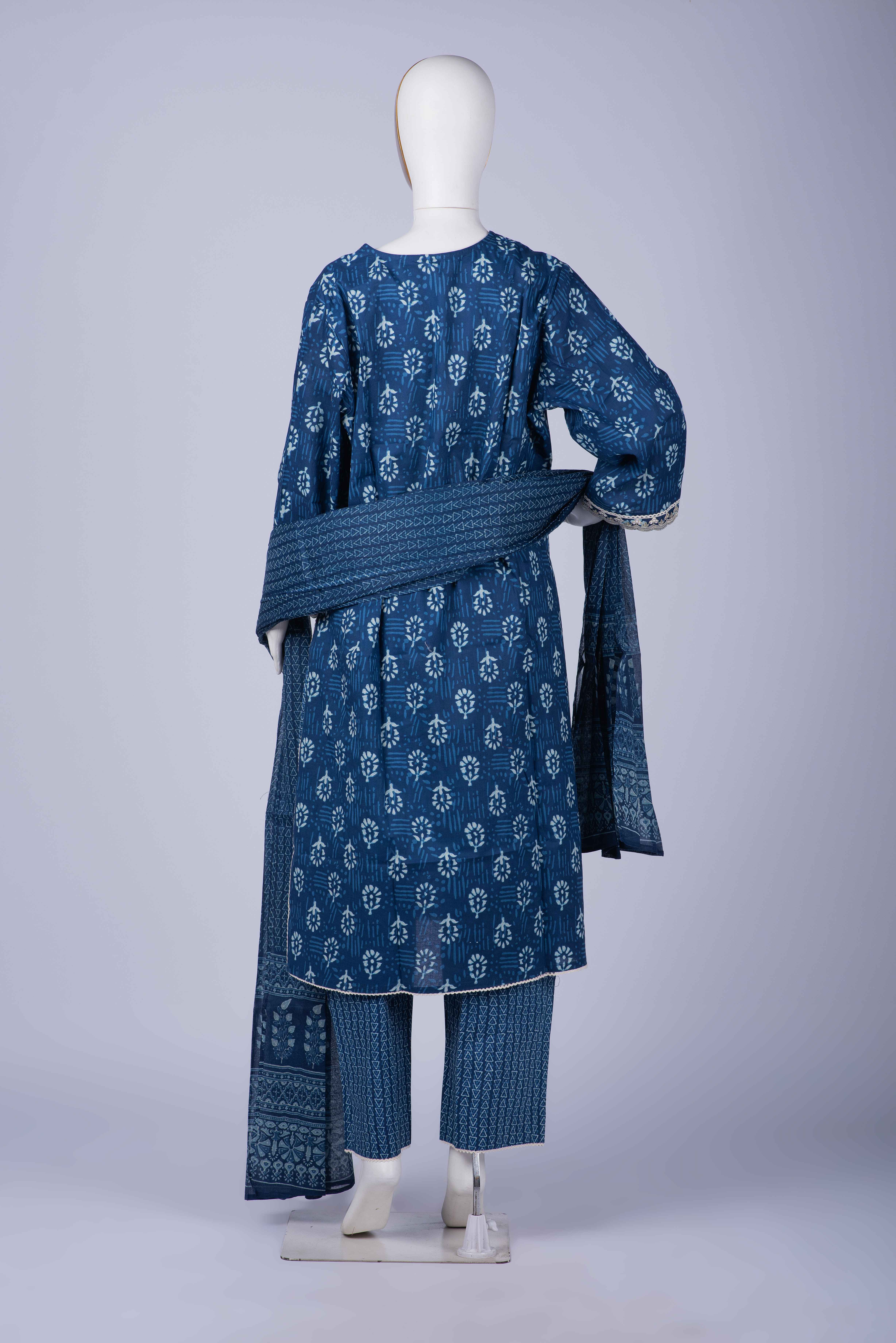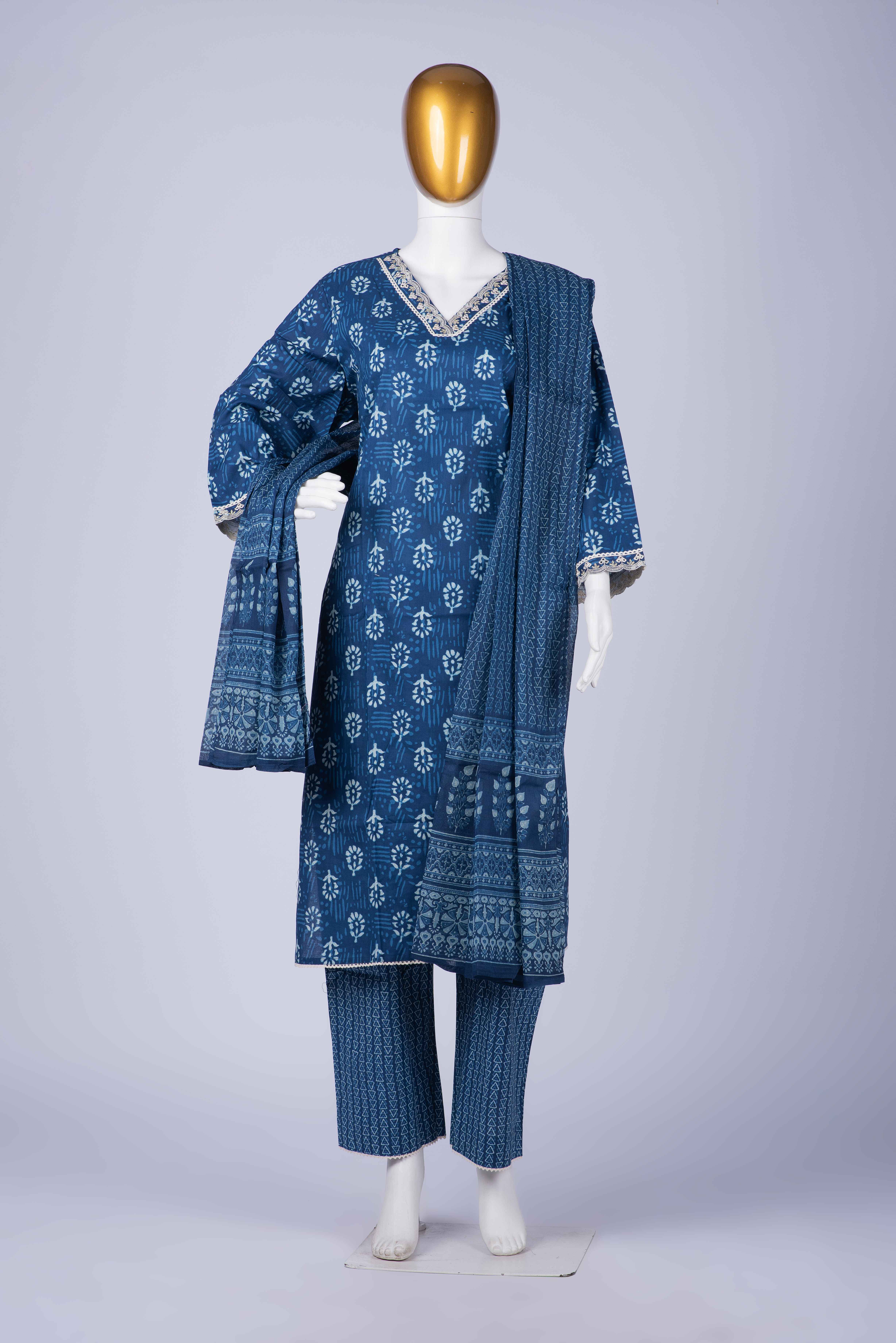 | If you are looking for that simple yet graceful piece which keeps you comfortable all day…this is it! All time favorite Indigo blue spells class! Intricate embroidery on yoke and sleeves add to the charm. The pants and dupatta also have that earthly hand block print! |