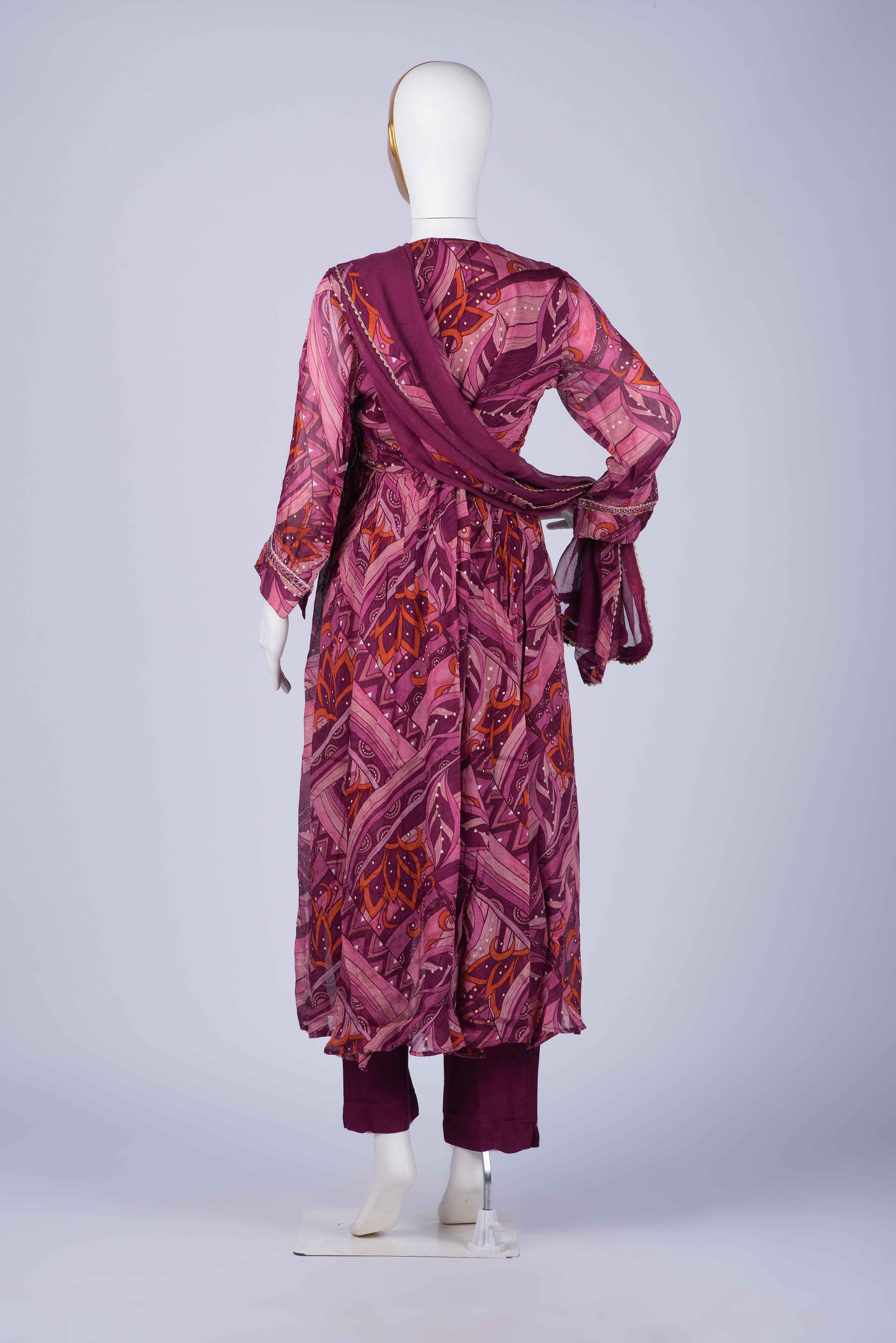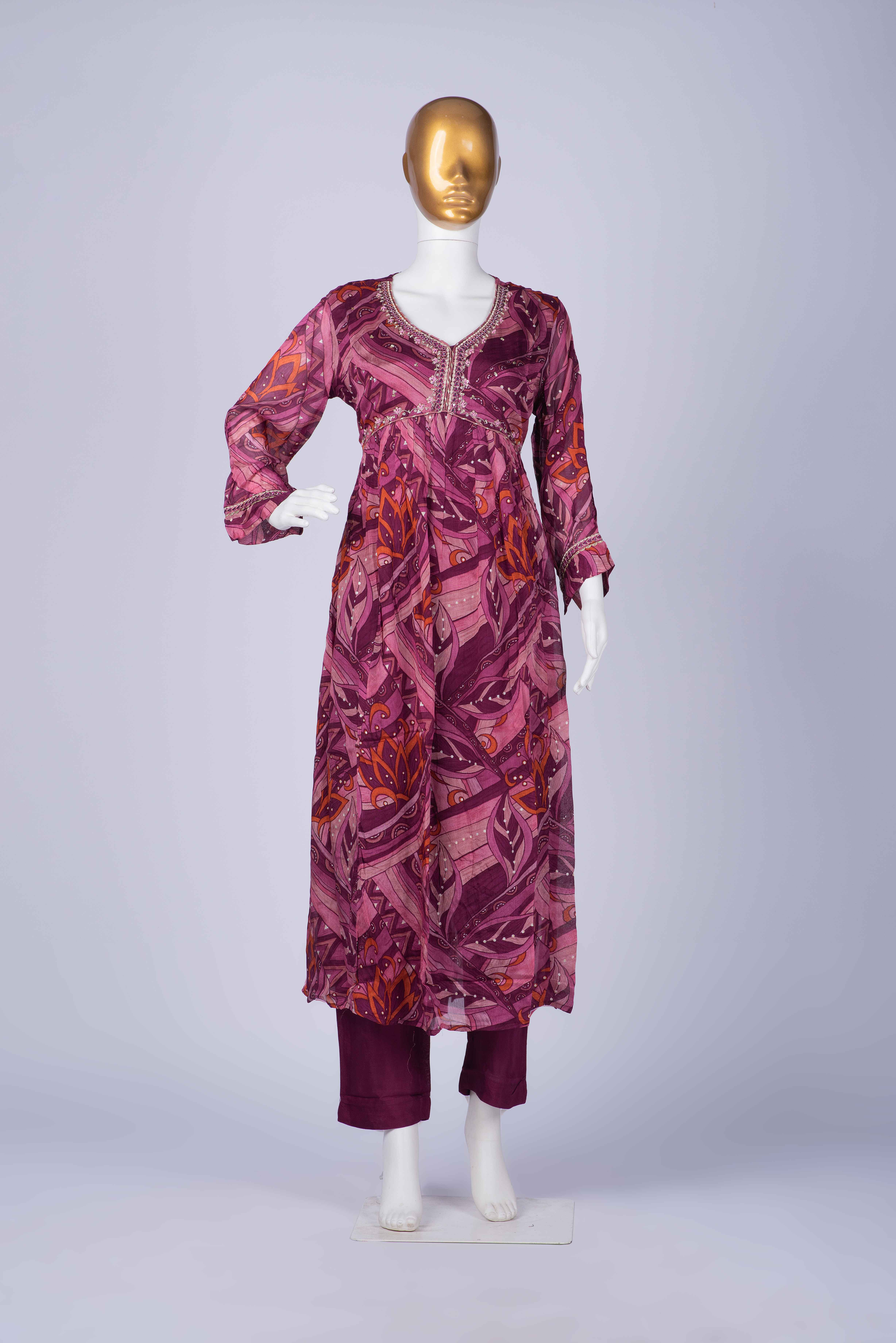 | Designer Alia-Cut Kurti pant dupatta set in pure fabrics-for that rich gorgeous look! Kurti has intricate mirror, pearl, sequence and gold work on yoke and sleeves. The flowy fabric gives a great fit. Inner is attached to the kurti. Its comes with smart pants and pure chiffon dupatta. |