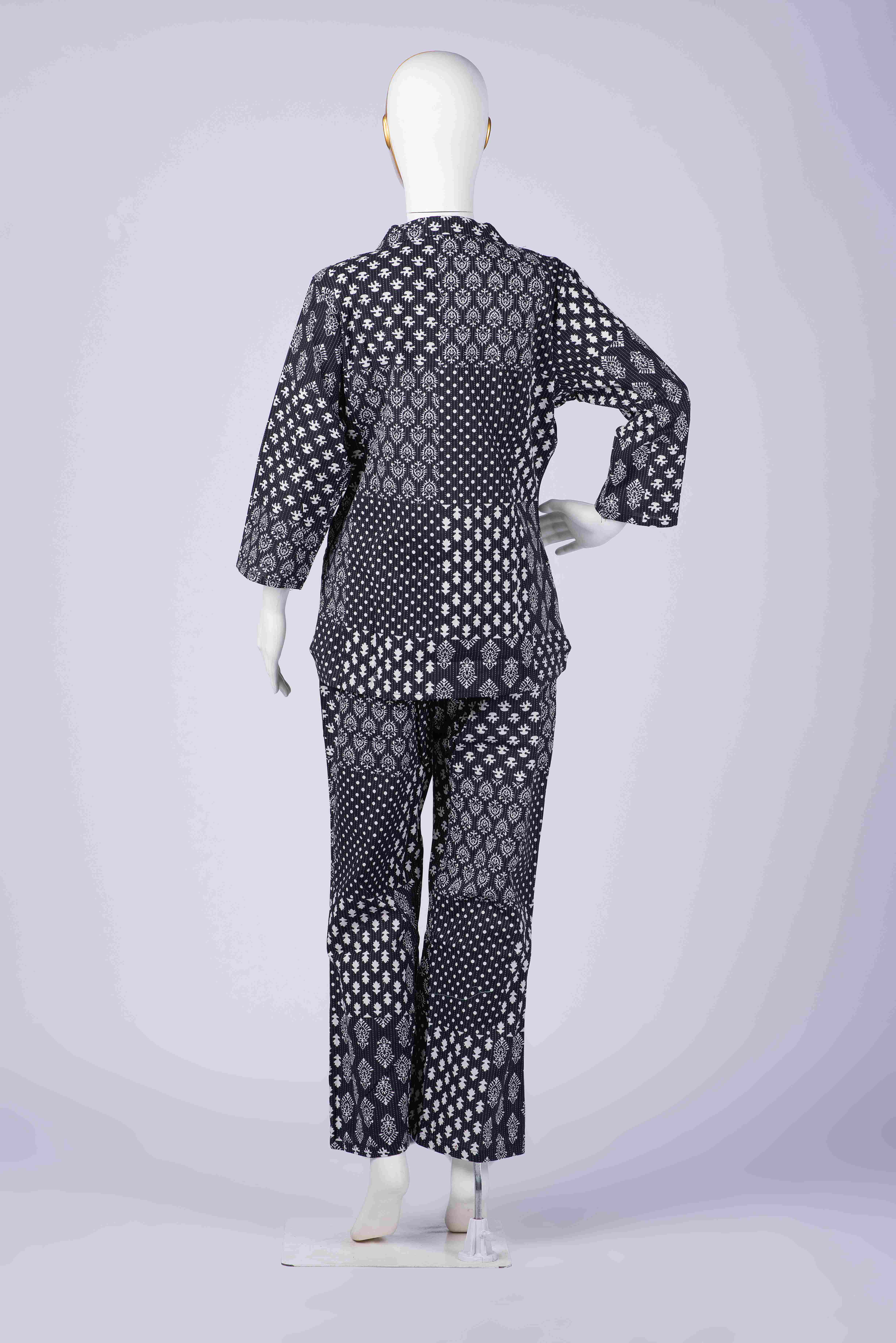 | Smart Co-ord sets in black andwhite, with a trench coat neck pattern gives a dashing look.Fabric has katha stitch prints all over.Pants have a stylish flared bottom,for that wow look! |