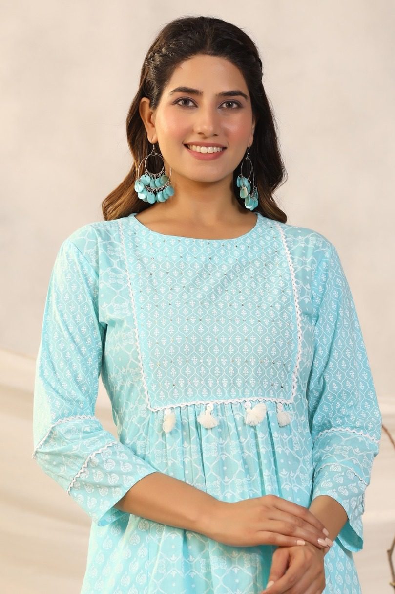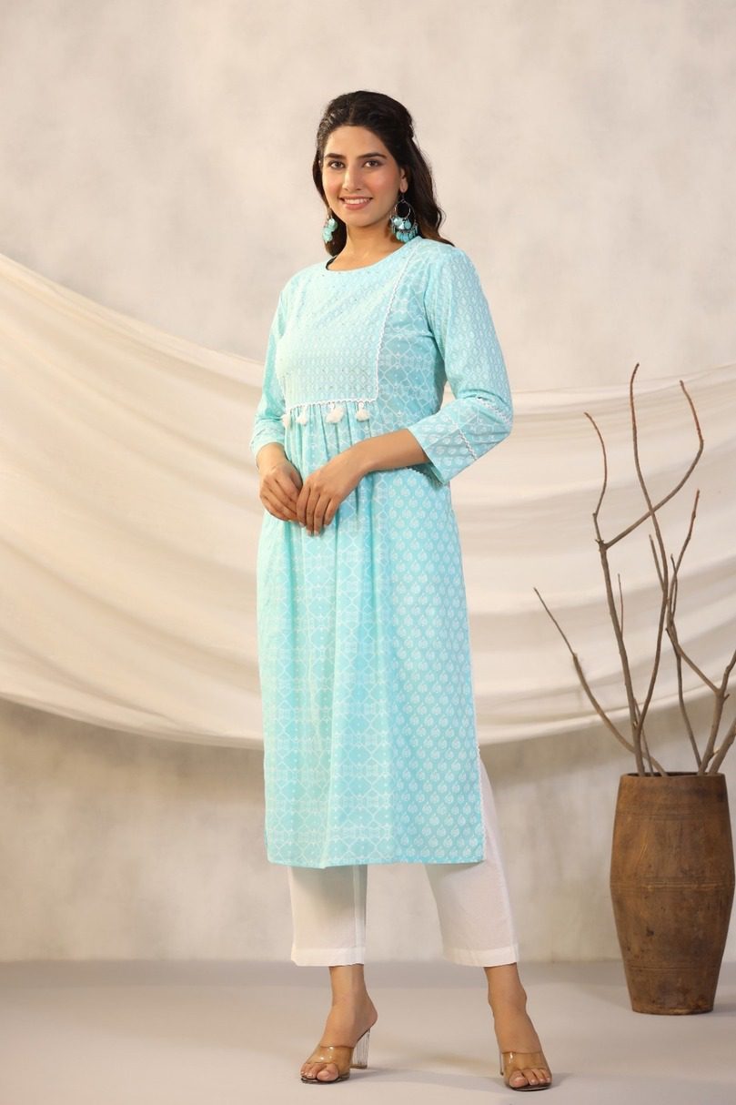 Straight cut kurti with both side pockets and small white prints in Sky Blue and pink color